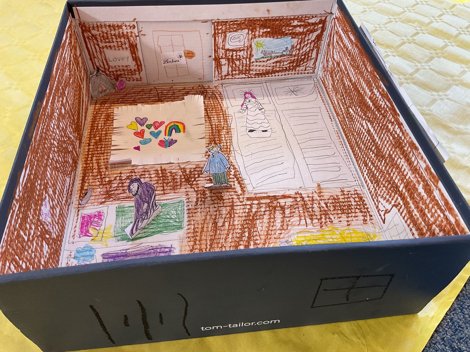 Im Rahmen des Religionsunterrichts haben sich die Erstklässler*innen intensiv mit dem Leben zur Zeit Jesu beschäftigt. Die Kinder haben viel über die Lebensumstände, die Kleidung, die Nahrung und die Berufe von vor 2000 Jahren erfahren. Sie haben Häuser aus Schuhkartons gebastelt und diese so gestaltet, wie es damals üblich war. Menschen und Tiere lebten in einem Raum.