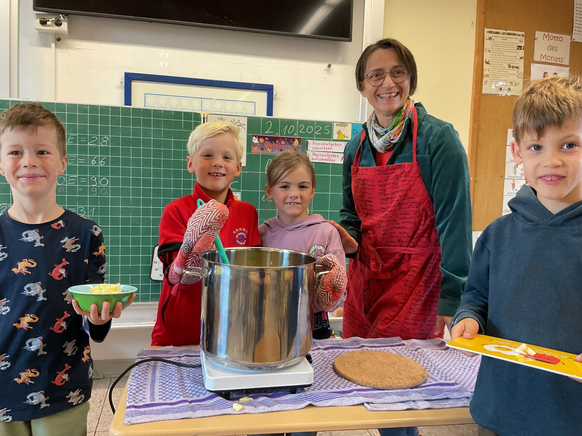 Die Klassen 2a und 2b haben mit ihren Klassenlehrerinnen Frau Wöstemeyer und Frau von Bohuszewicz im Unterricht ein Apfelmusrezept geschrieben. Dieses wurde in einer weiteren Unterrichtsstunde ausprobiert, wobei die Klassen sehr viel Spaß gehabt haben. Die Schülerinnen und Schüler haben Äpfel klein geschnitten und anschließend in einem großen Kochtopf aufgekocht. Dabei mussten die Äpfel immer wieder umgerührt werden, bis schließlich Apfelmus entstanden ist. Nach der Zubereitung wurde das Apfelmus mit viel Genuss gegessen.