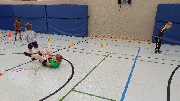 In weiteren Sportstunden absolvierten die Kinder mit viel Freude ein „Winter-Biathlon“: Sie fuhren im Skilanglauf auf ihren „Skiern“ (Teppichfliesen) im Slalom um Hütchen. Am „Schießstand“ konnten sie ihre Zielgenauigkeit unter Beweis stellen, indem sie versuchten, mit Bällen Kegel umzuwerfen. Anschließend rutschten sie bäuchlings auf den Fliesen durch den „Eistunnel“ (gewölbte Matten). Zum Schluss fuhren sie mit ihren Skiern über die „Eisbahn-Brücke“ (Langbänke) und schließlich durchs Ziel.