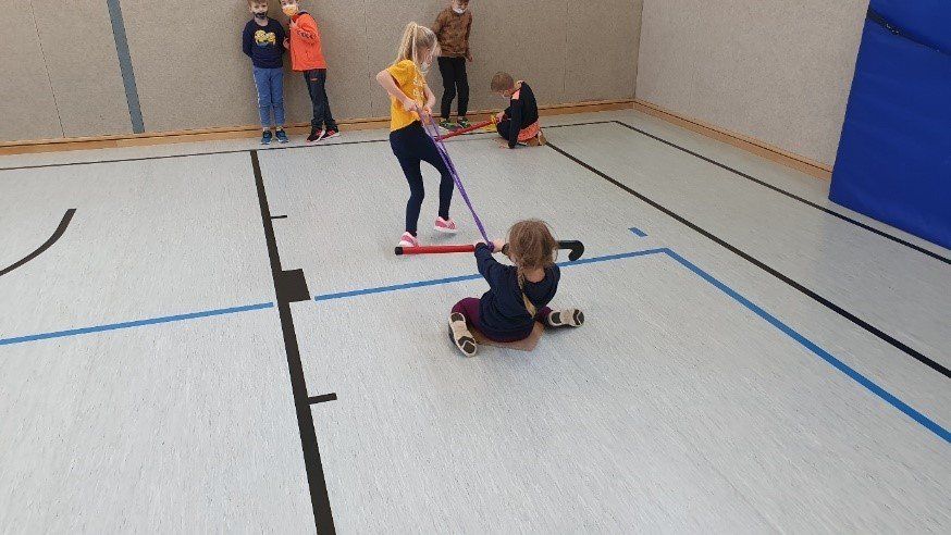 Um die Wartezeit an den Stationen zu überbrücken, konnten sich die Kinder von einem Partner eine Runde auf dem „Schlitten“ (Fliese) ziehen lassen. Das machte den Kindern besonders viel Spaß!