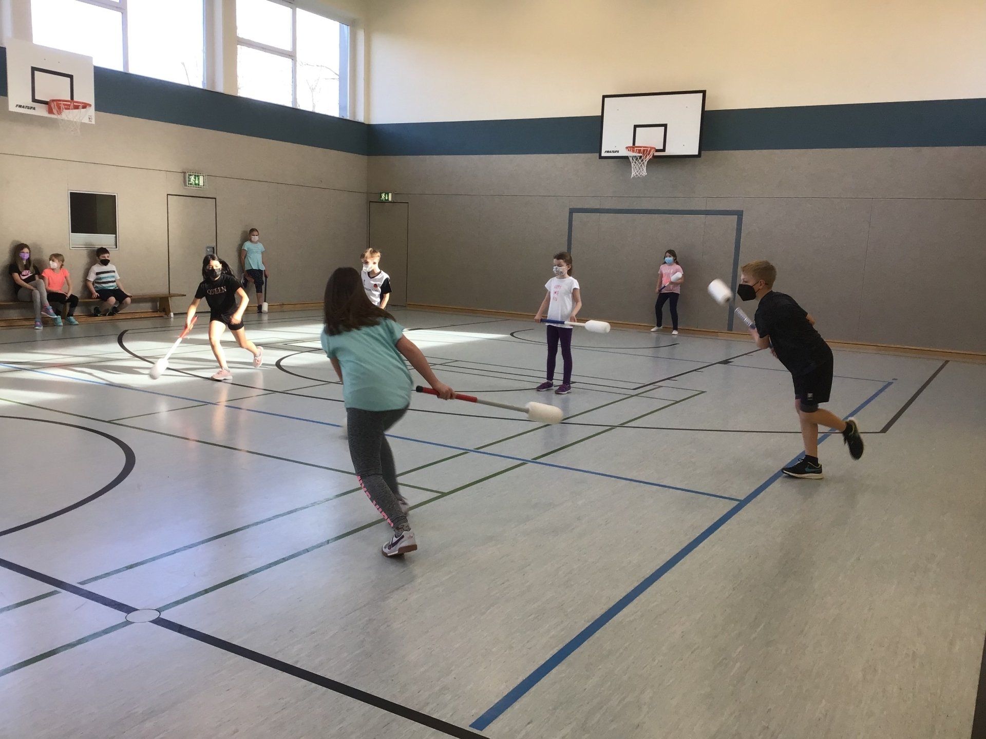 Auf die Plätze, fertig, los! – Die Klasse 4 hat im Sportunterricht ein Bouncerball-Turnier veranstaltet. Um ein Gefühl für den Umgang mit dem Schläger zu bekommen, haben die Schülerinnen und Schüler zunächst vielfältige Übungen absolviert. Dabei haben sich die Kinder den Ball aus unterschiedlichen Entfernungen zugespielt, sind mit Schläger und Ball Slalom um Hütchen gelaufen und haben den Torschuss geübt. Bei den Übungen haben die Kinder selbstständig herausgefunden, wie man den Schläger am besten hält und wie man zum Ball stehen muss, um den Partner möglichst zielgenau anspielen zu können. Anschließend haben wir die Regeln des Spiels gemeinsam besprochen und Mannschaften gebildet, um die Regeln im Spiel zu verinnerlichen. Nach ein paar Übungsrunden und anschließenden Reflexionsphasen haben die Kinder bereits taktische Spielzüge erkannt und im Spiel umsetzen können. Nun waren die Kinder bereit für das Klassen-Turnier. Im ersten Durchgang sind jeweils zwei Mannschaften durch Losverfahren gegeneinander angetreten. Im zweiten Durchgang haben die in Runde 1 ermittelten Erstplatzierten und die Zweitplatzierten gegeneinander gespielt. Das Duell um den dritten Platz war besonders spannend. Beide Mannschaften waren hoch motiviert und haben nicht aufgegeben. So konnten am Ende zwei Mannschaften für den 3. Platz geehrt werden. Alle Kinder haben bei der Siegerehrung eine Urkunde erhalten und sich über den gelungenen Abschluss gefreut.